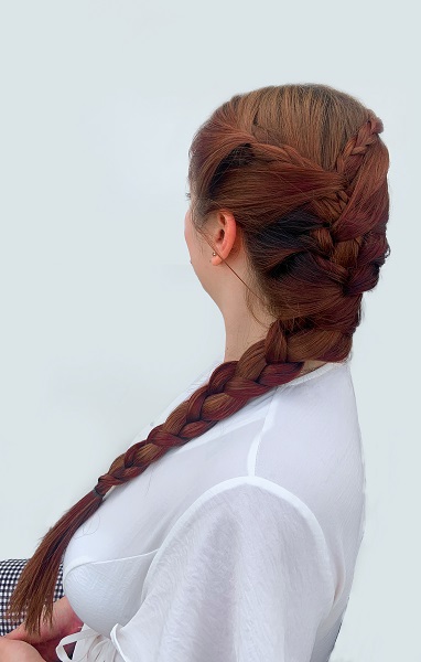Divide el cabello en la mitad, de cada lado escoge una porción de cabello y trénzala de cada lado y amárrala con una goma. Luego trenza todo el cabello y amarra con una goma y despéinala un poco.